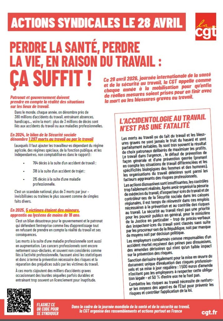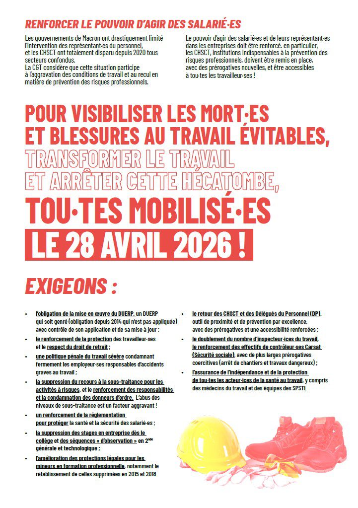 Ce 28 avril 2026, journée internationale de la santé et de la sécurité au travail, la CGT appelle comme chaque année à la mobilisation pour qu’enfin de réelles mesures soient prises pour en finir avec la mort ou les blessures graves au travail.